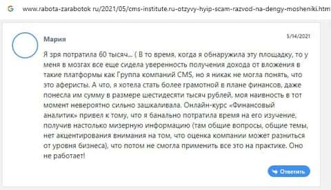 В данном разделе предоставлены отзывы пользователей, которые призывают не тратить свои денежные средства на псевдо-обучение на сайте компании CMS-Institute.