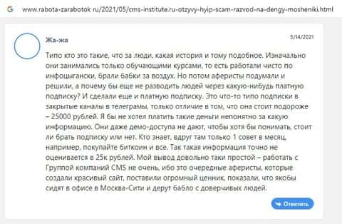 Аферистам ЦМС Институт пользователи не доверяют считая, что данная скам-организация берет завышенные суммы за свои вебинары.