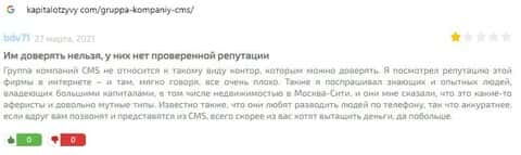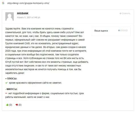 Автор отзыва пишет, что нет никакой конкретной информации о компании CMS Группа Компаний, в том числе и в социальных сетях, что подозрительно.