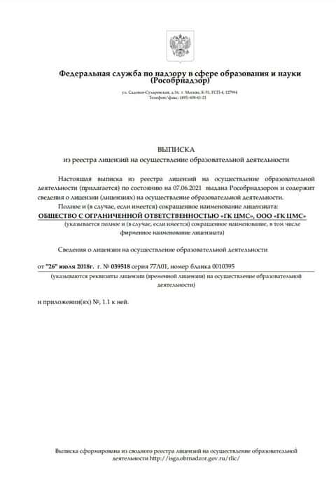 На официальном сайте реестра лицензий, который указан в их документе, а именно obrnadzor gov ru, нет никакой информации о лицензии такой компании как CMS-Institute.