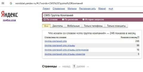 Количество запросов по бренду полного названия компании "CMS Группа Компаний" на Яндекс Вордстарт составляет 246 показов за месяц.