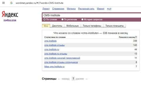 Количество брендовых запросов названия компании на английском языке "CMS-Institute" на Вордстарт Яндекс Ру составляет 338 запросов за месяц.
