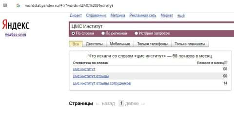 Количество брендовых запросов названия компании на русском языке "ЦМС Институт" на wordstat yandex ru составило 68 показов за месяц.