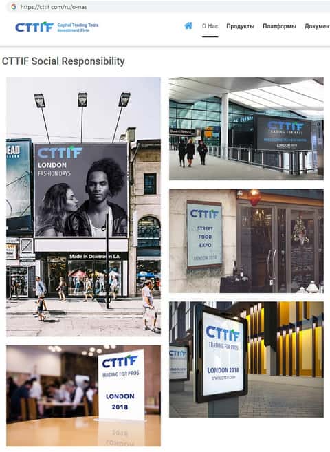 Про то, что CTTIF является лишь фальшивой платформой по вводу денег, можно судить по лживой информации на их сайте. Социальная ответственность CTTIF - результат умелой работы сотрудников шараги в фотошопе. Что может быть проще – прилепил свой логотип, и готово.