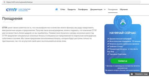 Разного рода бонусы и поощрения от брокера, как на сайте CTTIF, – один из явных признаков его заманивания клиентов с нечестными намерениями. На этой же странице с поощрениями аферисты предупреждают, что потерять на их площадке можно больше, чем инвестировать.