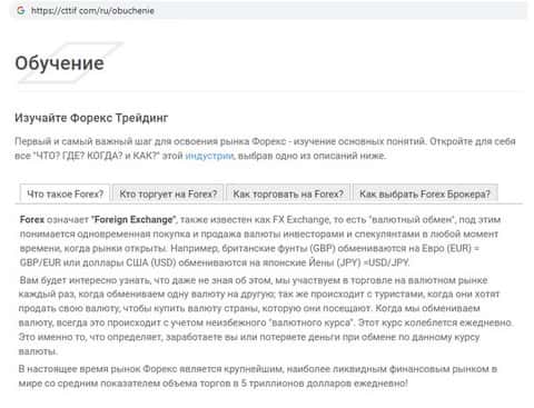Очередной пункт на портале CTTIF, касающийся обучения малоопытных трейдеров, не дает на самом деле никакой конкретной информации о том, как создать свою прибыльную стратегию заработка на мировом финансовом рынке. Жуликам и не нужно никого учить, ведь цель у них другая.