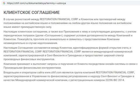 Клиенту сразу следует иметь в виду, что заключает он договор не с ЦТТИФ, а с иной конторой, зарегистрированной в Сент-Винсент и Гренадинах. Это значит, что подчиняется шарашка законам этого государства, а клиенты из других стран вернуть пропавшие средства не смогут.