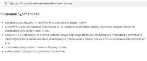 По договору клиент ЦТТИФ не сможет возмущаться в случае потери им денег, ведь он сам соглашается на то, что за все отвечает. Компания не дает вообще никаких гарантий – вкладывать деньги можно только под свою ответственность. И таких пунктов в договоре хватает.
