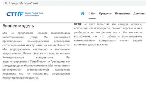 Да, и обратите внимание на информацию, которую сами аферисты CTTIF дают на странице О нас. Они оказывается вообще не предлагают лицензионных инвестиционных услуг. То есть, настаивая на внесении депозита, они явно лгут своим клиентам. Их цель – лишь украсть побольше денег.