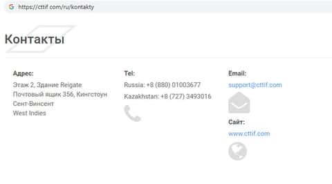 В разделе контактов скам-портала ЦТТИФ также находим не состыковки – адрес указан в Сент-Винсент, а телефоны – российский и почему-то казахстанский, адрес сайта несколько отличается от реального. Кроме того, в отзывах часто звучали и другие номера телефонов. Контакты конторы следующие: