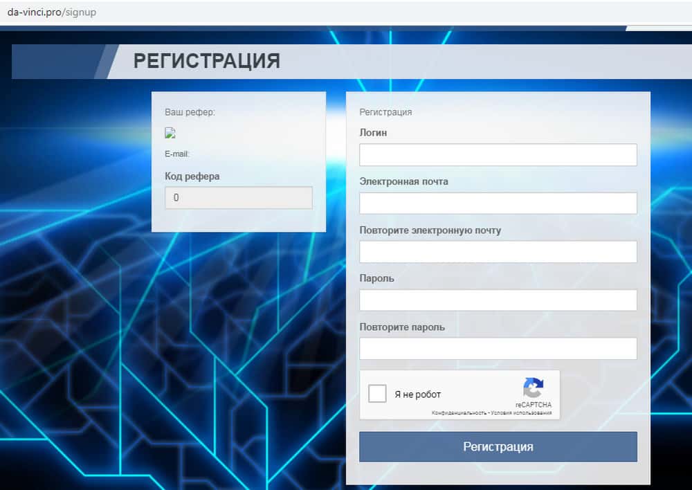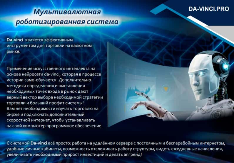Da-Vinci PRO - очередные мошенники сети интернет, которые занимаются наглым разводом наивных пользователей сети интернет как робот биржевой торговли форекс Да Винчи Про, в ходе которой аферисты оперативно и профессионально сливают пользователей. В связи с этим связываться с жуликами не рекомендуем !!!