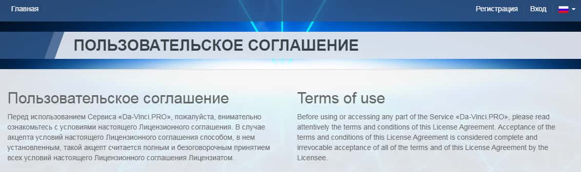 Так же на официальном сайте-лохотроне, который принадлежит компании Да Винчи Про можно найти информацию о правах использования сервиса Da-Vinci PRO и мнимом лицензионном соглашении.