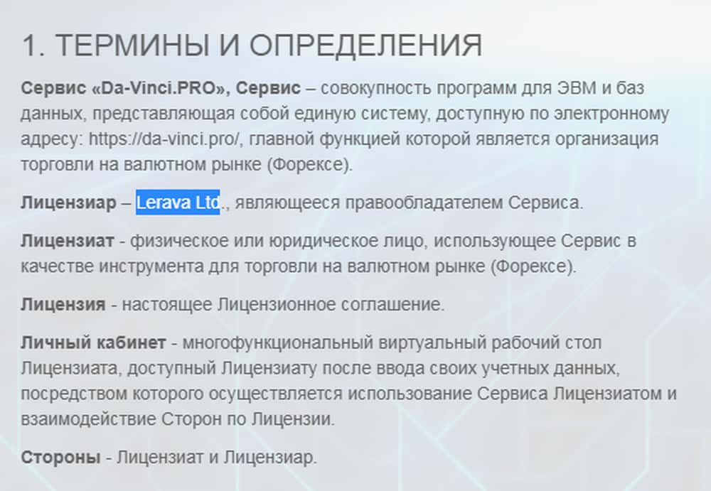 На сайте компании Da-Vinci PRO можно увидеть информацию о терминах и определениях клиентского соглашения организации Да Винчи Про. Наверняка это сделано чтобы втереться в доверие клиента.