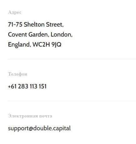 Далее представлены все контакты мошеннической конторы Double Capital, где указаны номер телефона, электронная почта и даже адрес регистрации. Вот собственно все данные: