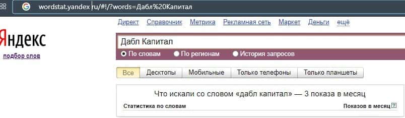 По запросу бренда "Дабл Капитал" в поисковой системе Яндекс, контора набрала 3 показов за месяц и она не является популярной интернете.