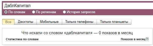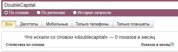 Другая ситуация и с брендом "DoubleCapital" в русскоязычном сайте-поисковике Яндекс. Показы приравниваются к значению 0 показов за месяц.
