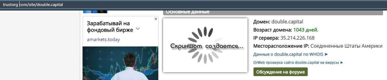 Официальный сайт псевдоконтора Дабл Капитал, по данным одного ресурса, был создан больше 1043 дней, но скорее-всего они просто купили этот домен.