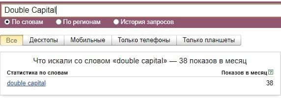 Такие же показатели и запроса бренда сайта с точкой. Бренд "Double.Capital" набрал за последний месяц 38 показов по версии Яндекс.Вордстат.