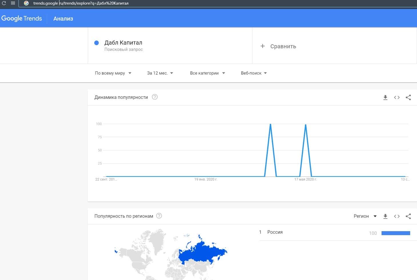 Что касается запросов по бренду "ДаблКапитал" согласно статистики Гугл Трендс, что здесь мошенники не набрали ни единого показа.