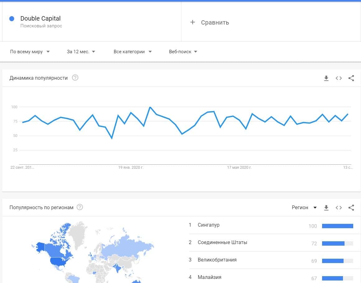 Та же самая ситуация и с брендом "Double Capital", который набрал множество показов за последнее время и запросы шли в основном из Сингапура, США, Великобритании и Малайзии.