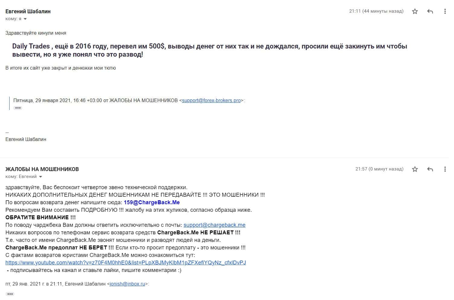 Если циничные обманщики Daily-trades Вас обворовали или хотели это сделать, то в такой ситуации оставьте Ваш е-майл чуть далее, и мы во что бы то ни стало с Вами выйдем на контакт по электронной почте.