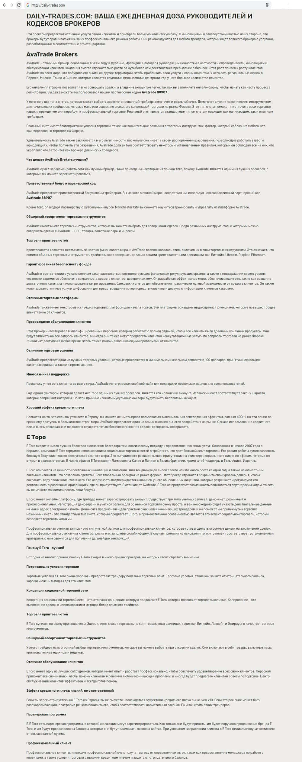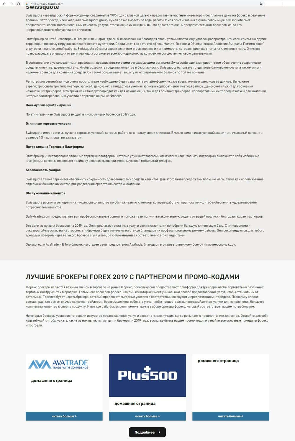Daily-trades - фейковый советник, который якобы делает обзоры лучших брокеров и дает советы трейдерам-новичкам. Согласно легенде, на контору работает штат экспертов, которые отбирают "лучшие" торговые платформы. Всех, кто попадется на удочку, кидалы сливают определенным брокерам-мошенникам, с которыми находятся в сговоре.