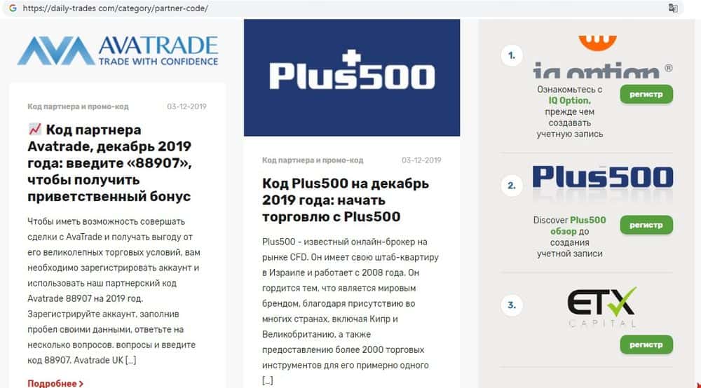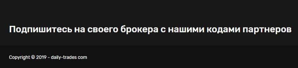 Странным звучит предложение аферистов Daily-trades воспользоваться промокодом и узнать "основные принципы форекс-торговли". Как одно с другим связано - непонятно. По их же словам, промокод всего лишь дает право на "приветственный бонус". Единственная цель сайта - вводить в заблуждение трейдеров и отсылать их в лапы партнеров-мошенников.