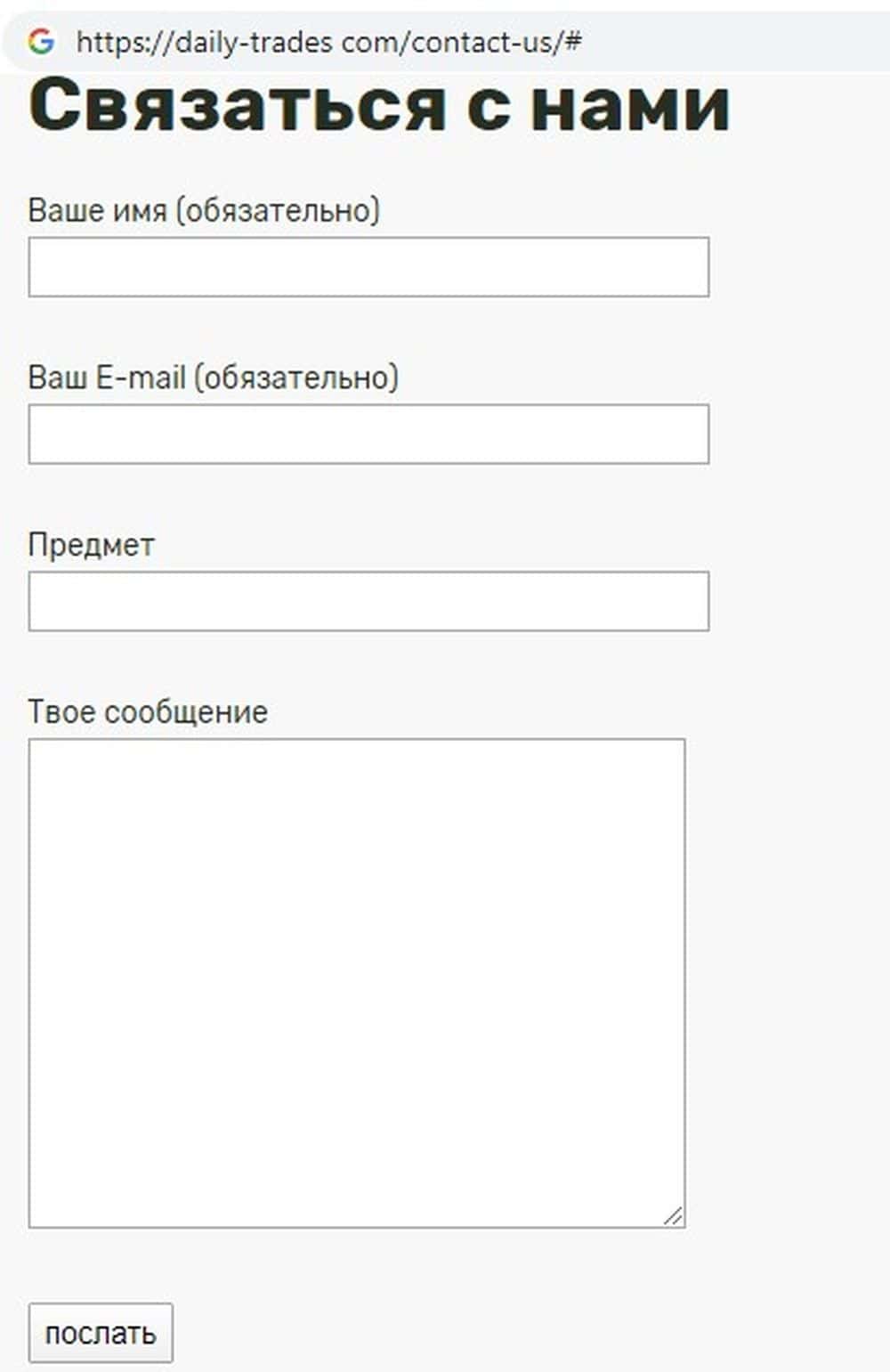 Кидалы Daily-trades решили, что предоставлять трейдерам-новичкам свои контакты - лишнее. Видимо, наученные горьким опытом, решили проявить осторожность. На сайте только форма обратной связи, и все. Ни электронной почты, ни номеров телефонов, ни даже адреса - обращаться в случае обмана просто некуда.