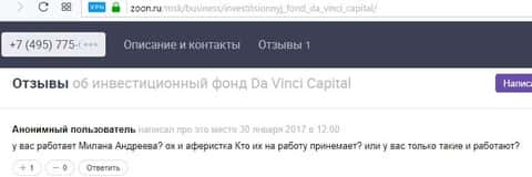 Интернет-пользователь высказал свое мнение по поводу сотрудников, которые работают в брокерской конторе Da Vinci Capital. он назвал имя Милана Андреева, которая прозванивает потенциальных жертв из базы клиентов и рассказывает про финансовые рынки, дабы завлечь человека и выманить у него деньги. Аферистка пользовалась моментом, пока клиент не понимал, что происходит и к чему она ведет. но когда дело дошло до вопросов по типу, сколько вы зарабатываете, то там уже стало ясно, к чему весь этот спектакль и чем занимается шарашкина контора ДаВинчи Капитал.