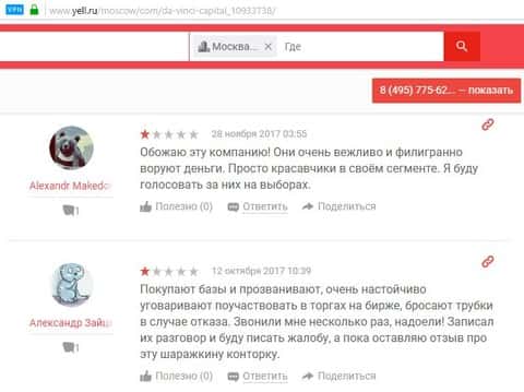 Несколько людей высказалось по поводу не честной работы конторщиков ДаВинчи Капитал. Аферисты очень вежливо и филигранно входят в доверие к своим клиентам, пока те не становятся их жертвами. Естественно деньги воруются, а от потерпевших мошенники отказываются, объясняя все ситуацией на рынке. А основная масса клиентов поступает к шулерам из баз телефонов, которые они покупают у своих пособников. Одного клиента так достало, что он решил написать жалобу на контору Da Vinci Capital за телефонный терроризм.