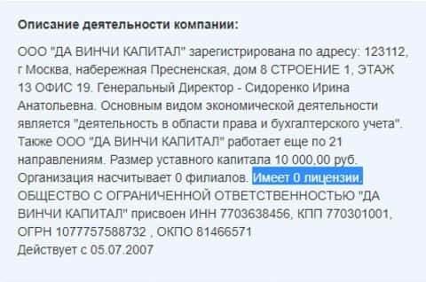 - Никакой информации о разрешении на деятельность конторы ДаВинчи Капитал нет