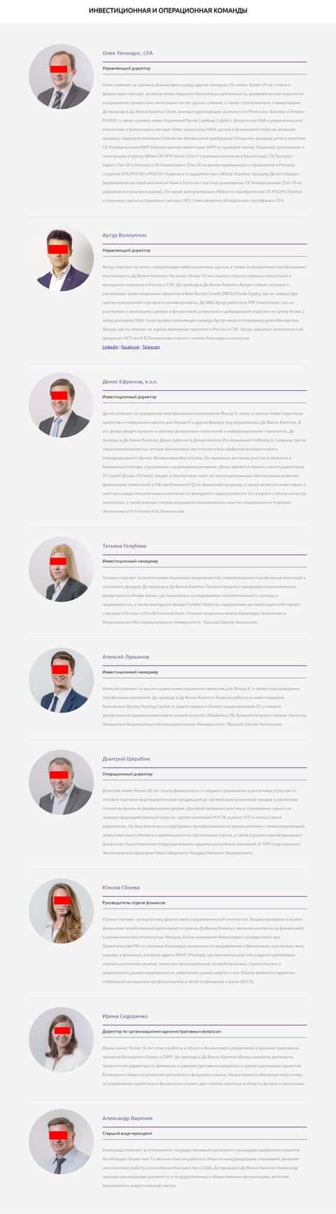 Далее идет по списку следующая группа руководителей Да Винчи Капитал, которая представлена в качестве Инвестиционной и операционной команды: