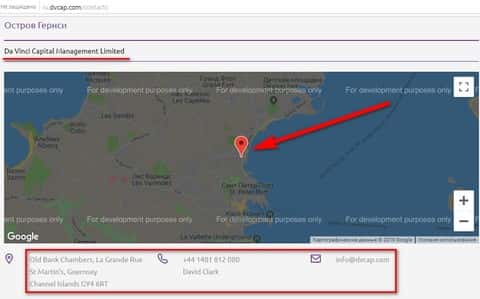 По поводу информации о контактных данных конторы ДаВинчи Капитал, чтобы не запутаться, нужно рассматривать по-порядку, так как у них множество различных офисов по всему миру. Начнем с офиса на острове Гернси, который является оффшорной зоной, куда и обычно располагают свои логова различные мошеннические организации. А вот собственно и сама информация: