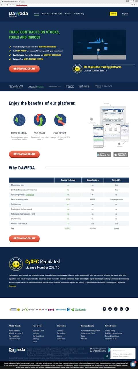 Daweda - ЕЩЕ ОДИН брокер на рынке forex, который, возможно, как и другие форекс-брокеры, ТУПО обувает наивных граждан на денежные средства. Мы предупреждаем всех игроков - остерегайтесь ЛЮБЫХ forex брокеров, не исключая и Daweda. Каждый, СОВЕРШЕННО каждый !!! брокер на валютном рынке, по нашему мнению - является АФЕРИСТОМ, и наше субъективное предположение такое: посредник на валютном рынке Даведа, скорее всего, не отличается от коллег по биржевому делу, и валютный брокер Даведа для нас - тоже является АФЕРИСТОМ !!!