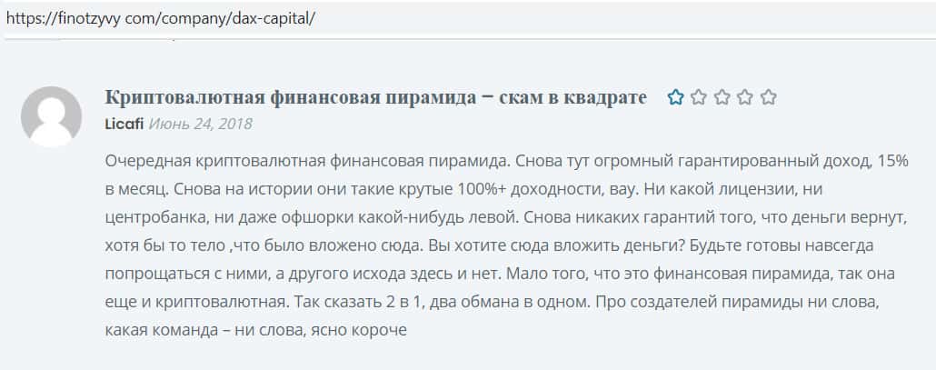 Автор отзыва с которым можно ознакомится далее утверждает, что ДАКС Капитал является криптовалютной пирамидой, потому как эта организация имеет все признаки скама, на сайте DAX Capital нет абсолютно никакой правдивой информации, есть только лживая реклама, рассчитанная на привлечение людей в лохотрон.