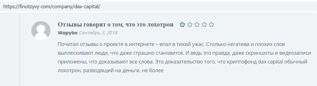 Интернет-пользователь, чей отзыв опубликован следующим, заявляет о принадлежности компании Dax Capital к числу обычных онлайн-лохотронов, где разводят доверчивых граждан на деньги, поэтому советуем держатся как можно дальше от жуликов ДАКС Капитал, данный скам проект работает лишь на ввод клиентских средств.