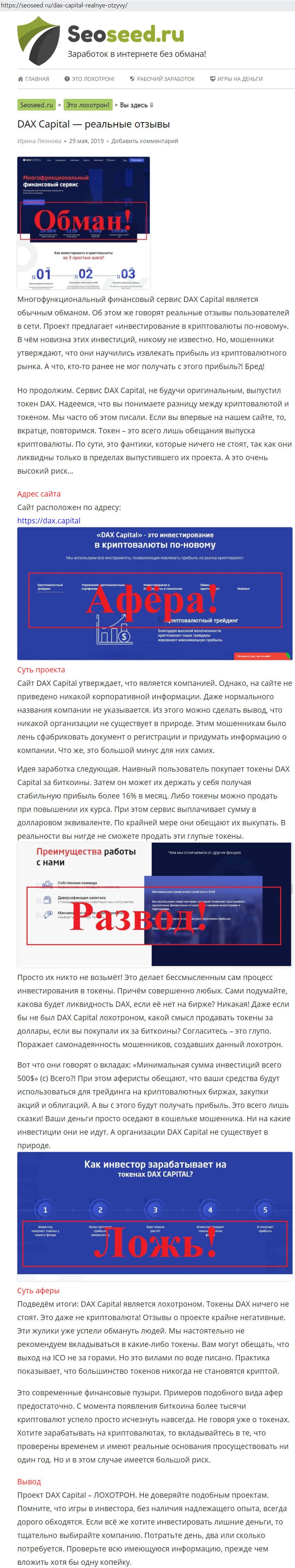 Разоблачение мошеннической организации DaxCapital на сайте SeoSeed Ru