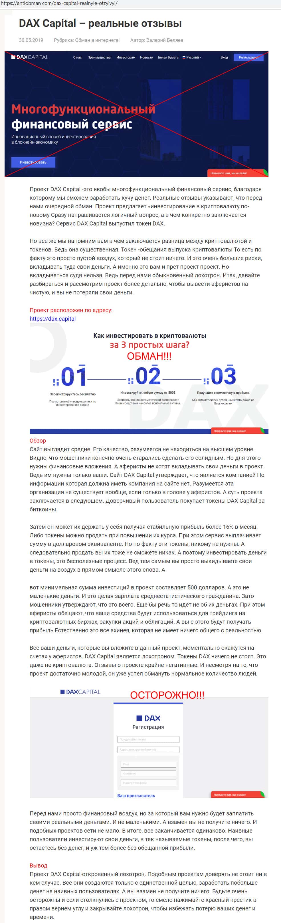 Автор статьи об аферистах сети Интернет в виде конторы DAX Capital
