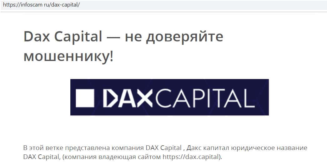 - Сведения о мошеннической компании Dax Capital на сайте InfoScam Ru