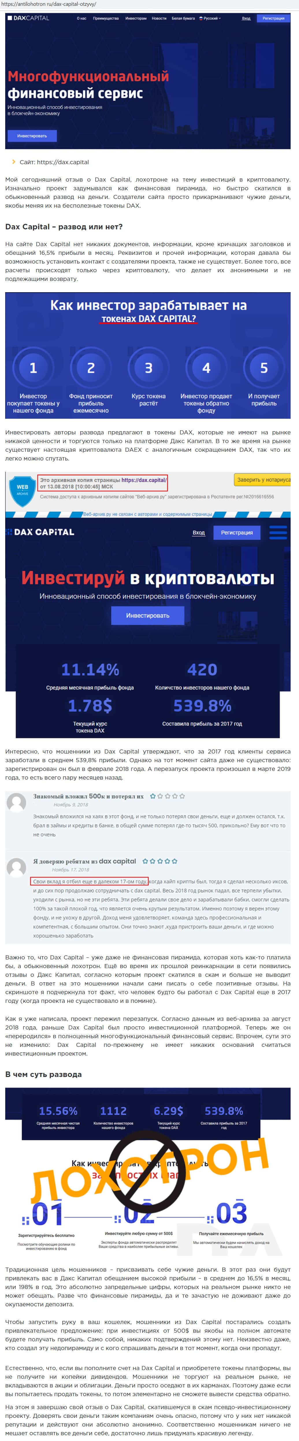 Обзор мошеннического проекта Dax Capital на AntiLohotron Ru