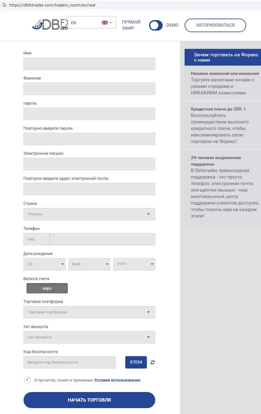 Для того, чтобы зарегистрироваться на сайте мошенников DBFXTrades необходимо назвать имя, фамилию, адрес электронной почты, страну проживания, номер контактного телефона и пароль, и конечно же подтвердить то, что Вы соглашаетесь с условиями пользования сайтом. Прежде чем поставить галочку в данной форме, подумайте стоит ли так рисковать своими деньгами?