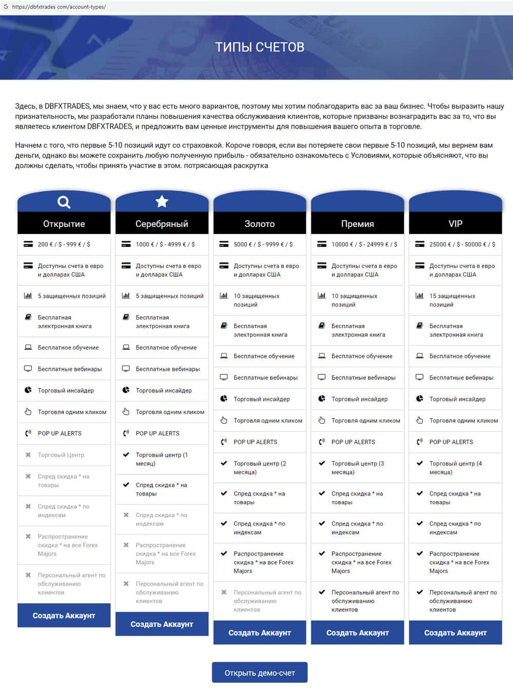 Типы торговых счетов на сайте мошеннической конторы ДБФХ Трейдес