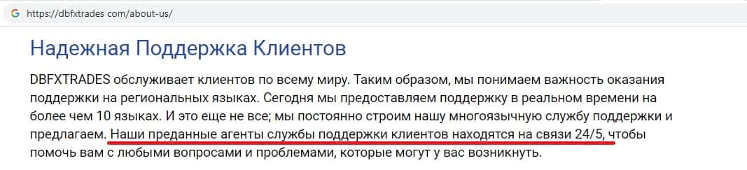 Аферисты DBFXTrades утверждают, что на их сайте имеется техническая поддержка клиентов, которая предоставляется на разных языках, главным из которых является английский. Не стоит надеяться на какую-либо поддержку со стороны скам-конторы ДБФХ Трейдес, поскольку в случае потери денежных средств на их сайте попросту никто не будет брать трубку.