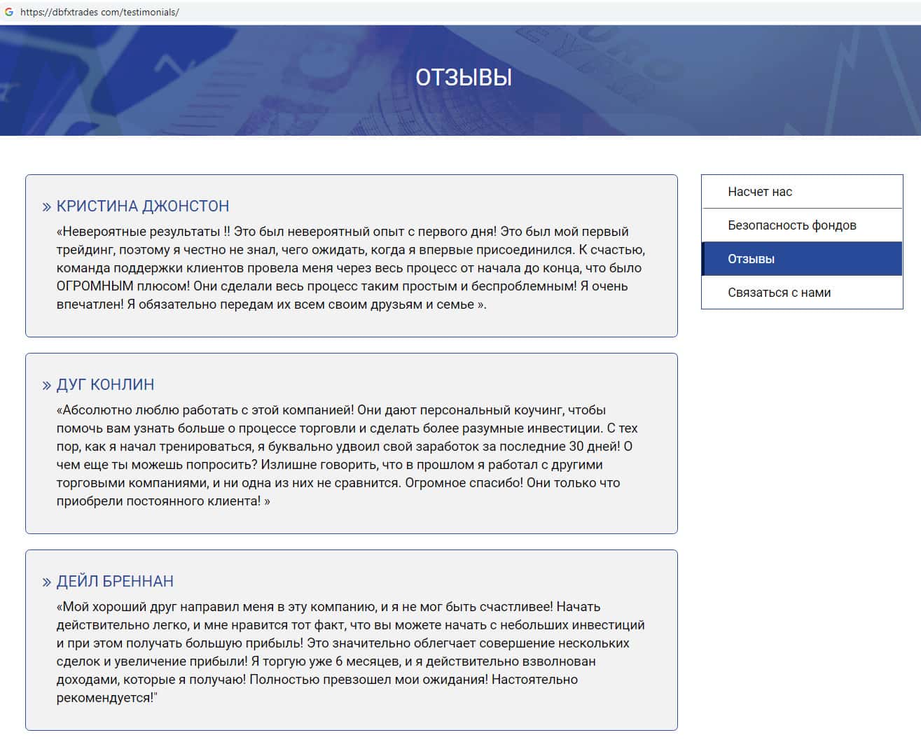Мошенники DBFXTrades на своем официальном интернет-ресурсе опубликовали якобы правдивые пользовательские отзывы, которые вероятнее всего сами о себе написали. В интернете не обнаружено ни одного настоящего отзыва о данной скам-конторе. Это является подтверждением того, что аферисты отслеживают информацию о своей компании.