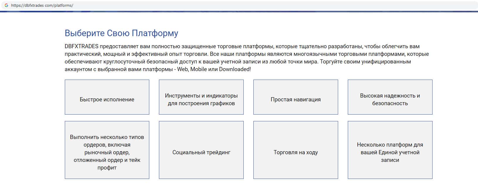О каких-либо преимуществах торговой платформы на сайте аферистов DBFXTrades не может быть и речи, потому что на нее взглянуть можно только лишь зарегистрированным пользователям. Поэтому велика вероятность того, что платформа будет зависать в самый неподходящий момент !!!