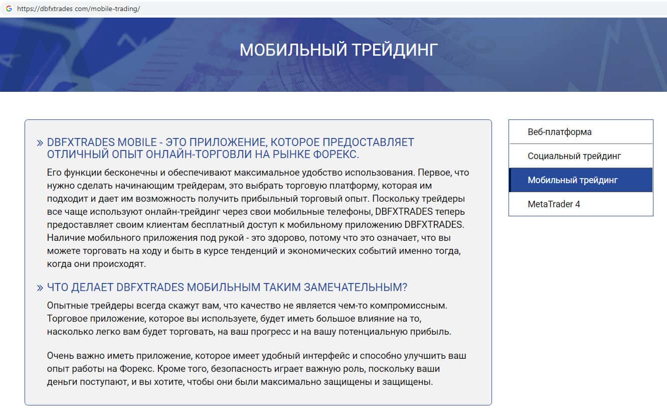Шулера DBFXTrades предлагают пользователю скачать приложение с торговой платформой сайта на смартфон. На самом деле это делается для того, чтобы подсадить клиента на крючок. Ни в коем случае не скачивайте приложения с торговой платформой ДБФХ Трейдес, потому что это лохотрон и очередной обман !!!