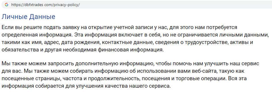 - Политика конфиденциальности на сайте скам-брокера ДБФХ Трейдес
