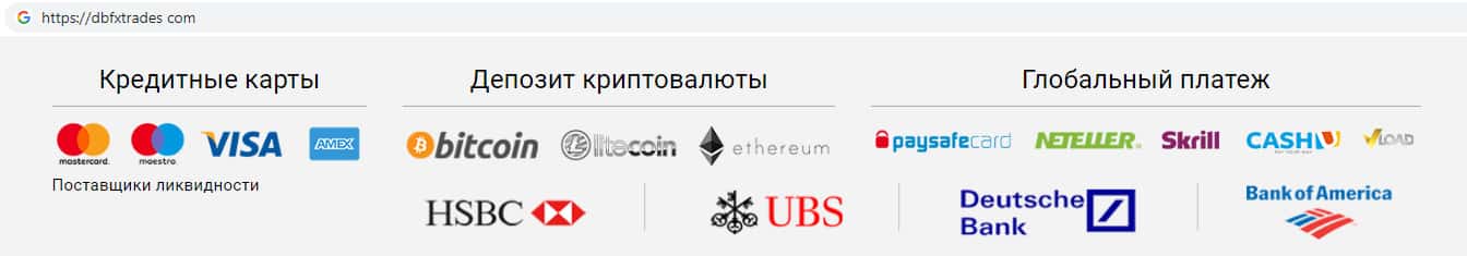 Для перевода денежных средств шулера DBFXTrades предоставляют на своем официальном сайте множество платежных систем, якобы предоставляя выбор клиенту каким способом можно пополнить торговый счет. Связавшись со скам-брокером ДБФХ Трейдес Вы должны понимать, что подобные организации зачастую не возвращают деньги людям.