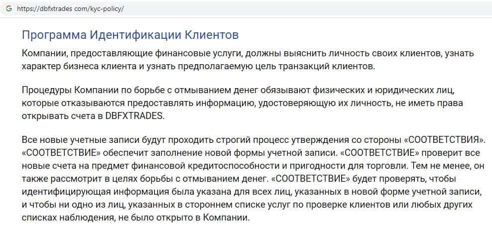 Шулера DBFXTrades пытаются создать видимость того, что ведут борьбу с отмыванием денежных средств. Данный документ, именно в таком виде как предоставили мошенники ДБФХ Трейдес, имеется у каждой жульнической конторы, которая пытается доказать честность и надежность предоставления услуг своей компании.
