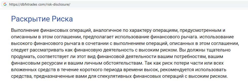 Информация о всевозможных рисках на сайте жуликов DBFXTrades